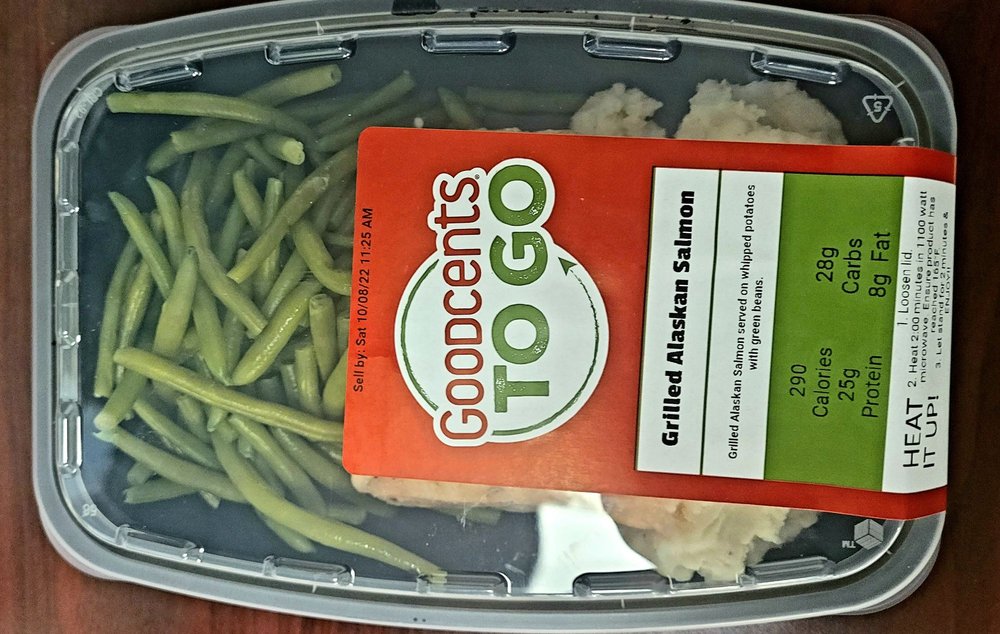 ALL Goodcents To Go meals include a 50 cent donation to a local charity. Grilled Alaskan salmon served on buttery mashed Yukon potatoes with green beans (Must reheat to eat, Not Customizable)